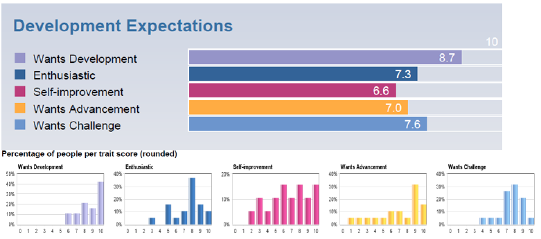 Por exemplo, na imagem abaixo, numa dada empresa, podemos ver que, em relação às expectativas de desenvolvimento dos colaboradores, o peso que lhes atribuem é muito elevado (8.7 em 10), e que mais de 40% da população, atribui mesmo o peso máximo (10 em 10) às oportunidades de desenvolvimento que a empresa lhes dá.
